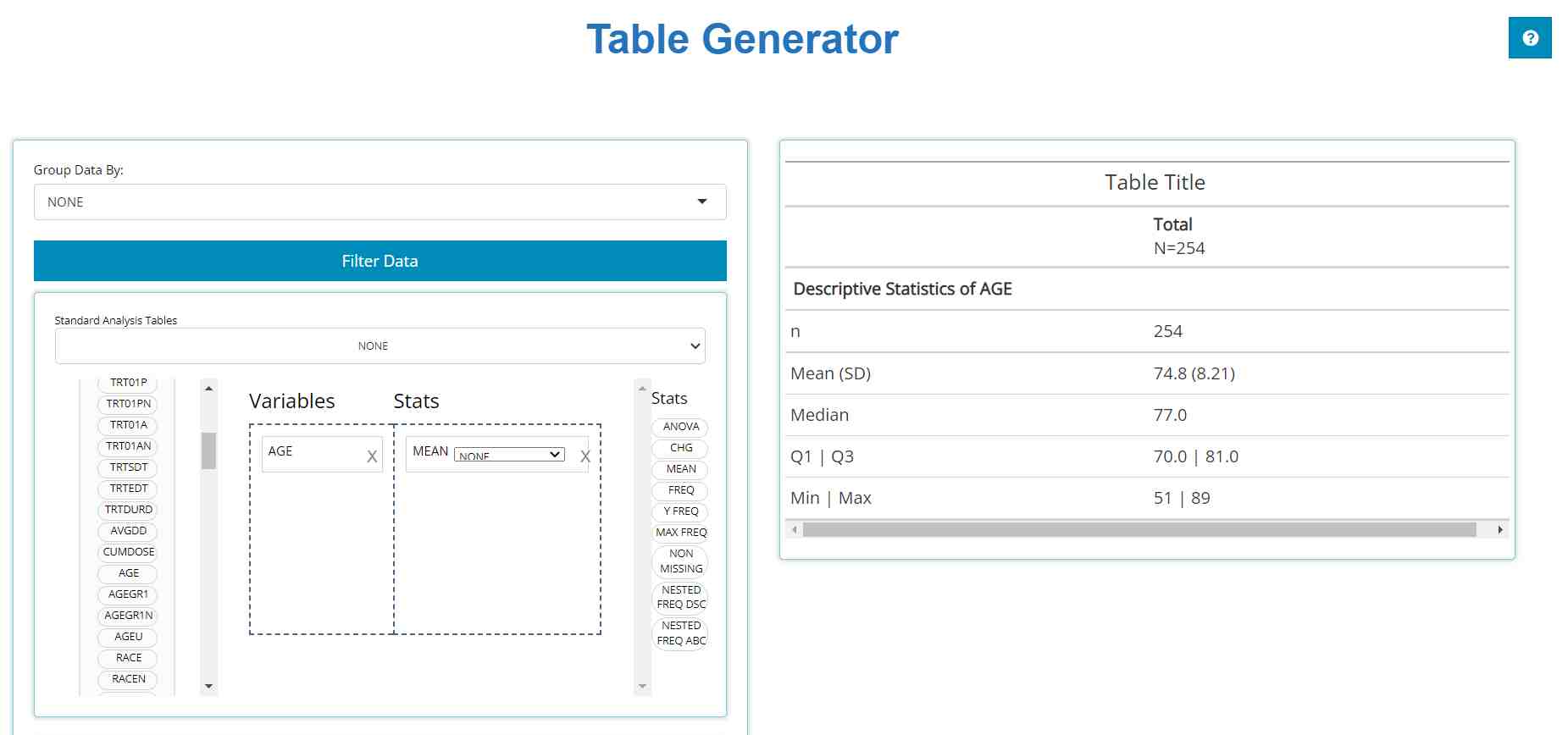 The Table Generator tab is divided in two: the area to the left is the handy drag-and-drop interface used to define our tables, and on the right is the real-time table output.