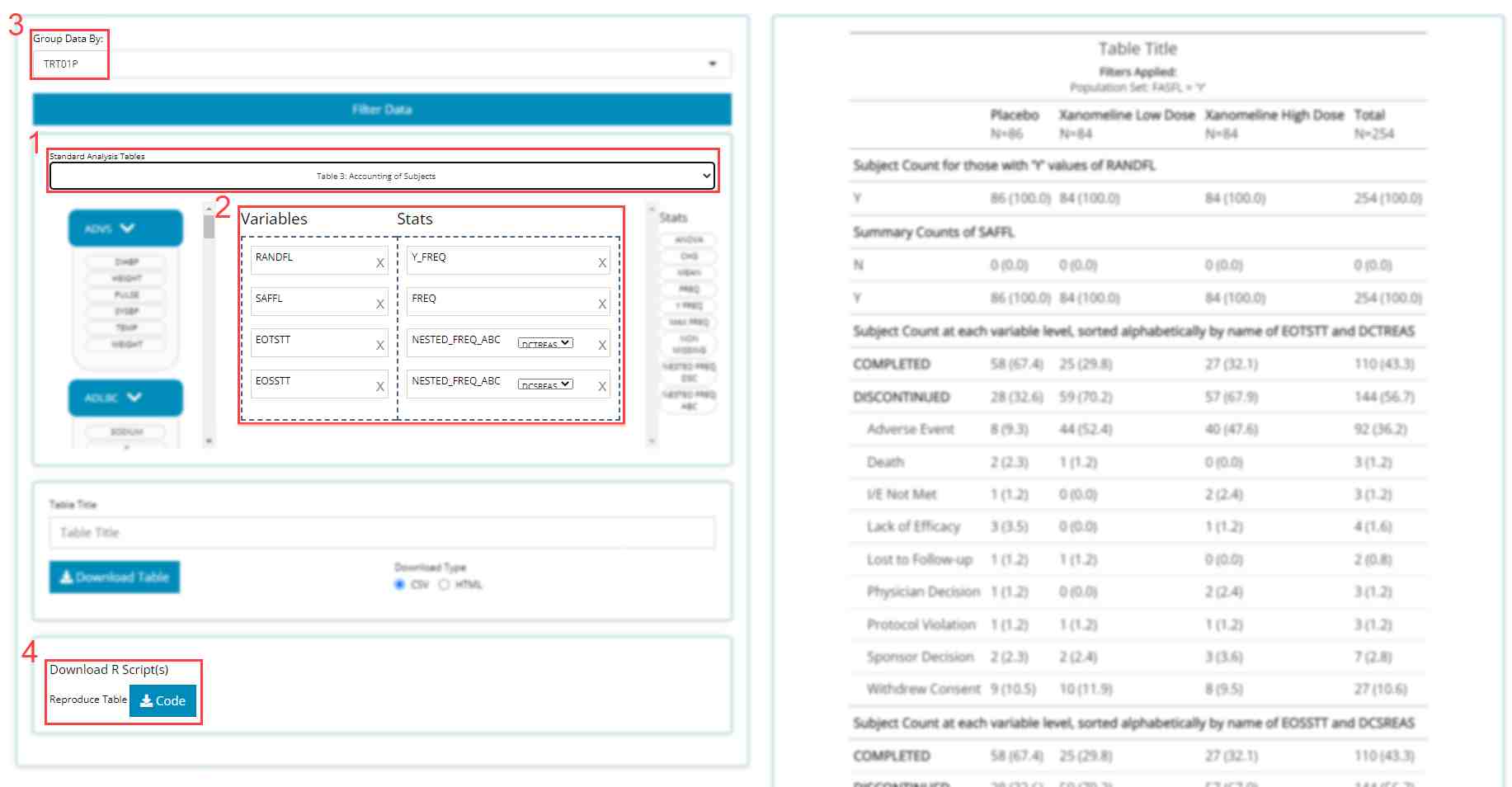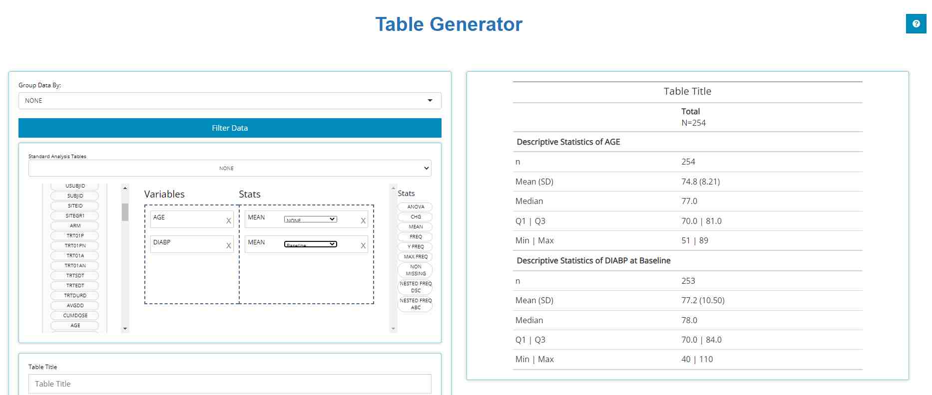 So far, we’ve learned how to upload data, drag and drop blocks in the table generator as well as build a bonafide standard analysis table and export its reproducible R code. Next we plotted mean diastolic blood pressure over time in the population explorer and define filters on the individual explorer tab to find the patients and analyze patient profiles responsible for elevating one subgroup’s values.